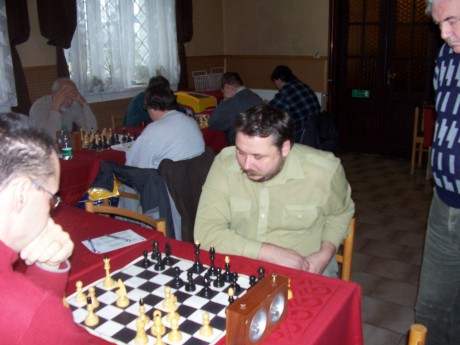 Jára Šimek nejprve skoro hodinu čekal na soupeře a posléze s vyhranou pozicí mohl pro náš tým urvat celkovou remízu, bohužel ale neuspěl. V pozadí partie Mašín-Fokt, Vančura-Dobiáš a Uhlíř (přihlíží dění na pátém prkně) - Železný.